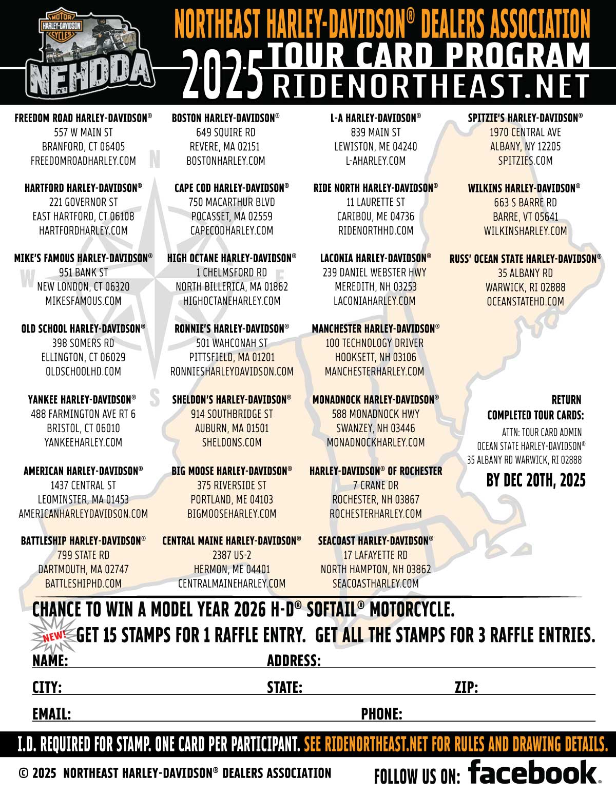 HOW TO ENTER: Get 15 stamps or complete a Tour Card by visiting Northeast Harley-Davidson® Dealers Association member dealers between January 25 and December 20 and getting Tour Card stamped and signed at each location by dealership representative. Only one card (entry) per person. Person whose name is on the front of the Tour Card must be present to get dealer stamp. You may be asked for a photo ID at the dealership. Dealer will require your name and address for listing on their verification form. Tour Card can be obtained by printing from the website. Alternatively, pick up a Tour Card at Northeast Harley-Davidson® Dealers Association sponsored events throughout the Northeast. Tour cards are also available at member dealerships. No facsimiles or mechanical reproductions of entries will be accepted. Tour Card must be completed and mailed (postmarked no later than December 20). Entrant Name and Address must be completed on the Tour Card in order to win. Dealership signatures and stamps on the Tour Card will be verified for authenticity and winner's name will be checked against dealership visit verification lists. Sponsor may disqualify or prohibit a participant from participating in the Program for any reason at Sponsor's sole discretion and without notice.