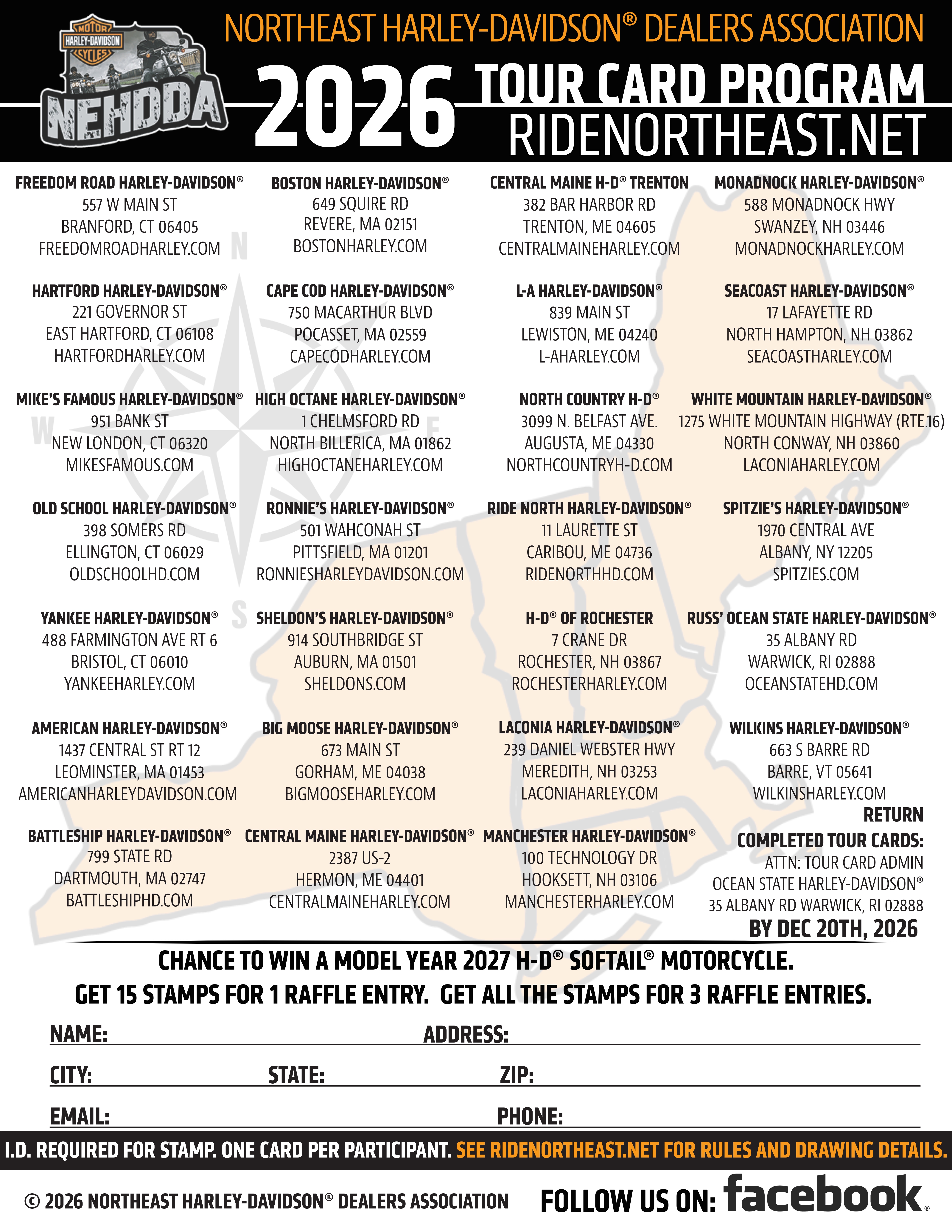 The 2026 Tour Card Program is now Live! Download and print the card below and get ready to Ride the Northeast! The drawing for the 2026 Tour Card will be held at Laconia H-D in January 2027. Time and date TBD.